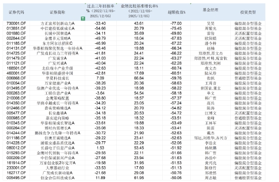 以张坤、葛兰、赵诣、刘彦春、刘格菘、范妍等多位基金司理为例,他们管理的百亿基金在当年三年均跑输功绩比较基准10%以上,其中刘格菘管理的广发科技前锋当年三年的收益率为-8.99%,而同时功绩比较基准收益率则到达了34.02%,两者进出43.01%。