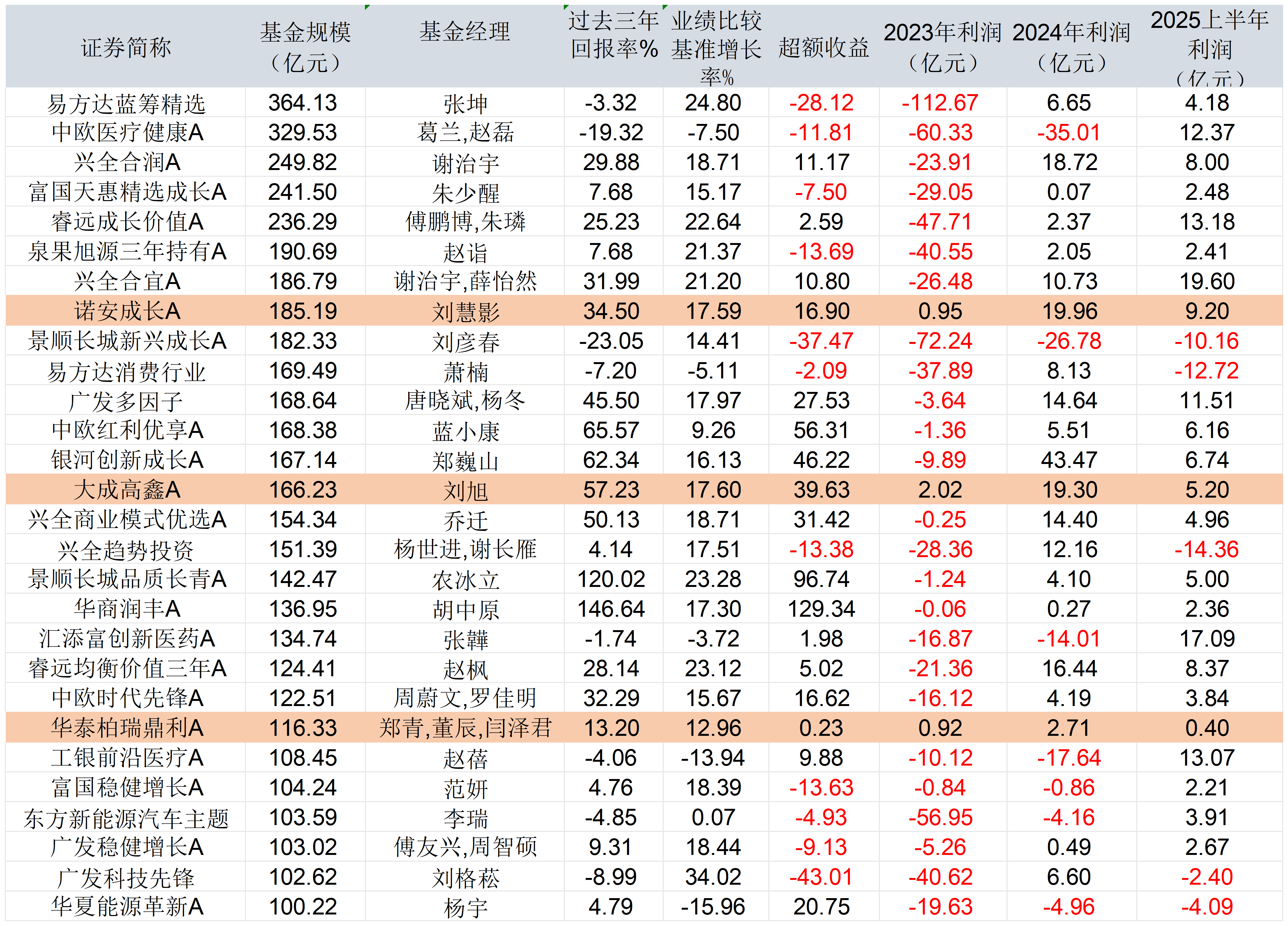 表:适度2025年上半年,28只百亿主动基金司理应年三年逾额收益和净利润明细 开始:Wind 界面新闻整理